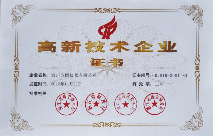 熱烈慶祝溫州方圓儀器有限公司通過高新技術企業(yè)復審,順利獲得浙江省高新技術企業(yè)證書